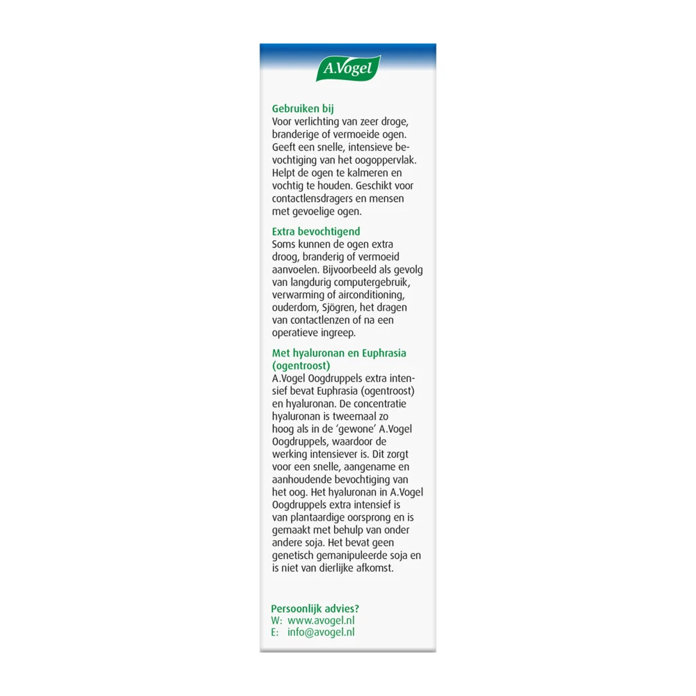 A.Vogel Oogdruppels Extra IntensiefMedisch hulpmiddel A.Vogel Oogdruppels Extra Intensief gebruik je bij zeer droge ogen. Als je zeer droge, branderige of vermoeide ogen hebt dan geven deze oogdruppels een snelle, intensieve bevochtiging van het oogoppervlak. Daarnaast helpt het bij het behoud van voldoende traanvocht in het oog. Oogdruppels Extra Intensief is geschikt voor contactlensdragers en bij gevoelige ogen.Helpen bij het behoud van voldoende traanvochtZorgen voor een snelle, extra en lan