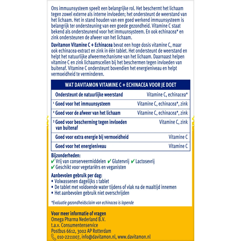 Davitamon Vitamine C + EchinaceaDavitamon Vitamine C + Echinacea is een weerstand vitamine dat bestaat uit een hoge dosis vitamine C, zink en het kruid echinacea is toegevoegd. Dit supplement ondersteunt de weerstand en helpt het natuurlijke afweermechanisme van het lichaam. Daarnaast helpen vitamine C en zink lichaamscellen bij het beschermen tegen invloeden van buitenaf. Vitamine C ondersteunt bovendien het energieniveau en helpt vermoeidheid te verminderen.Goed voor het immuunsysteem&su