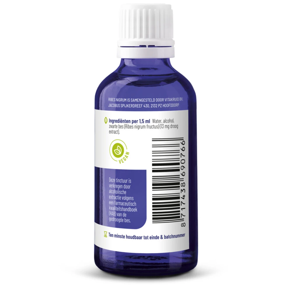Vitakruid Ribes Nigrum TinctuurVitakruid Ribes Nigrum Tinctuur is een tinctuur op basis van natuurzuiver extract uit de vrucht van de zwarte bessenstruik. Deze bes is rijk aan aan vitaminen, mineralen, sporenelementen en de meervoudig onverzadigde vetzuren gamma-linoleenzuur en alfalinoleenzuur.Ribes Nigrum draagt bij tot de normale werking van spieren en helpt gewrichten soepel te houden*Ribes Nigrum helpt bij een goede vochthuishouding en is goed voor de functie van nieren en urinewegen*Ribes