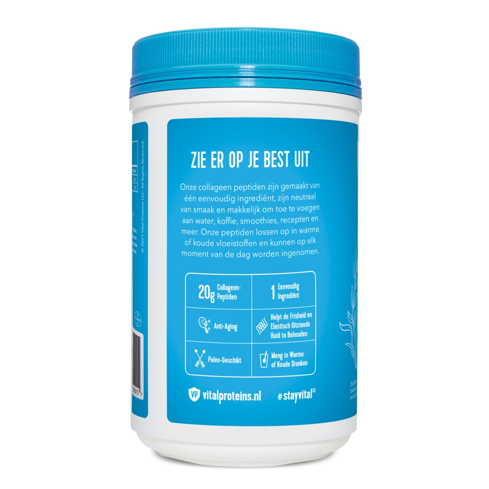 Vital Proteins Collageen PeptidenCollageen Peptiden van Vital Proteins is een niet-gearomatiseerd poeder dat per portie bomvol 20 g hoogwaardige collageenpeptiden van runderen zit. Collageen is een belangrijk eiwit dat aanwezig is in al onze bindweefsels, pezen, ligamenten en botten met als doel om deze lichaamsdelen hun kracht, structuur en elasticiteit te geven. Collageen ondersteunt een gezonde huid, nagels en haarNiet-gearomatiseerd poeder dat zowel in warme als koude drankjes kan