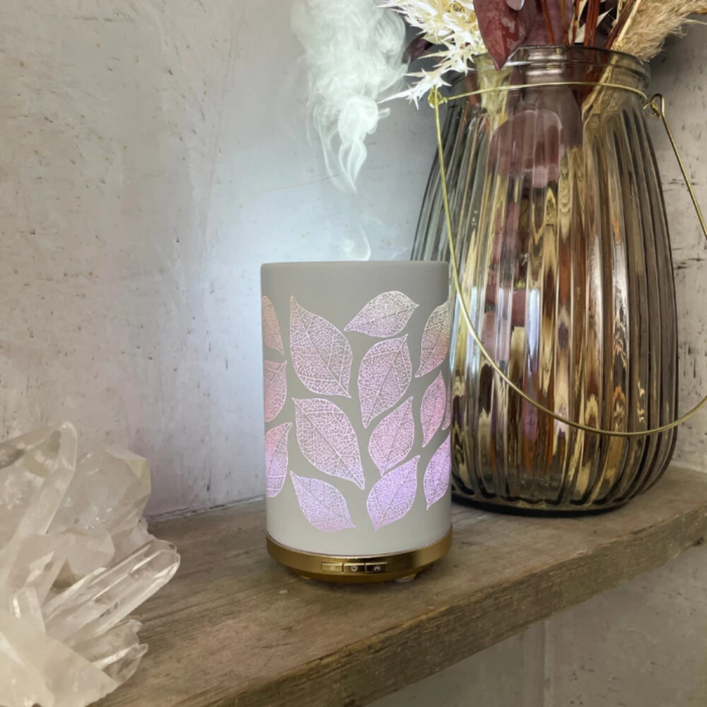 Chi Verdamper LeavesChi Verdamper Leaves met sfeerlicht zorgt niet alleen voor een lekkere geur in huis, maar bevochtigt en zuivert ook de lucht. Verdamp tot 8 uur lang je favoriete etherische olie of mix van oliën en creëer zo je eigen sfeer. Kies voor een intense of juist voor een zachte verdamping of voor de intervalfunctie. De fijne waterdamp komt als een mist uit de aromaverstuiver. De glazen kap van de Leaves verdamper is van wit glas met een gouden onderstel, het is een echte ey